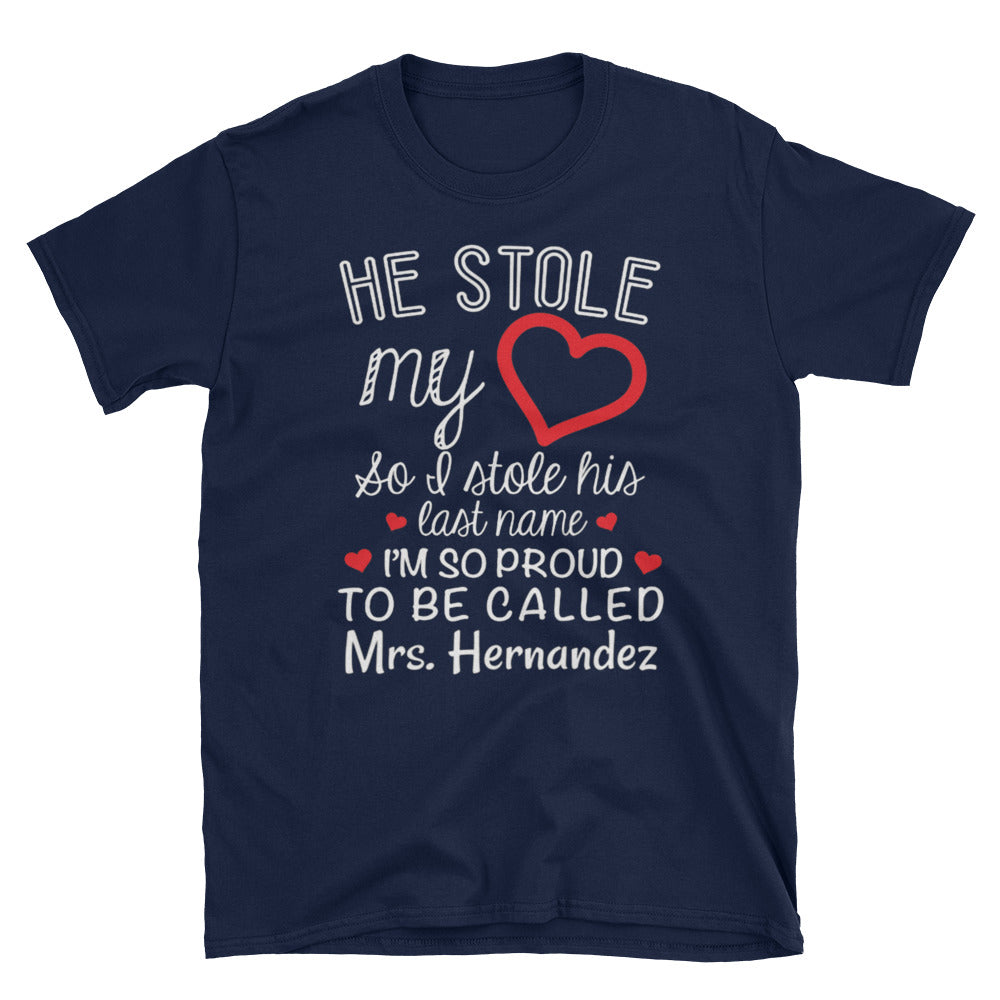 Personalized He Stole My Heart So I Stole His Last Name I'm So Proud To Be Called Short-Sleeve Unisex T-Shirt, Funny T-shirt For New Wife a