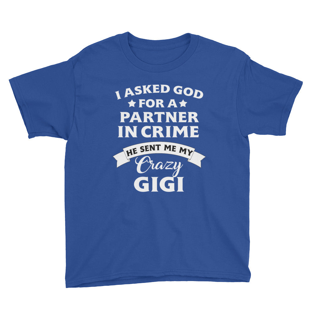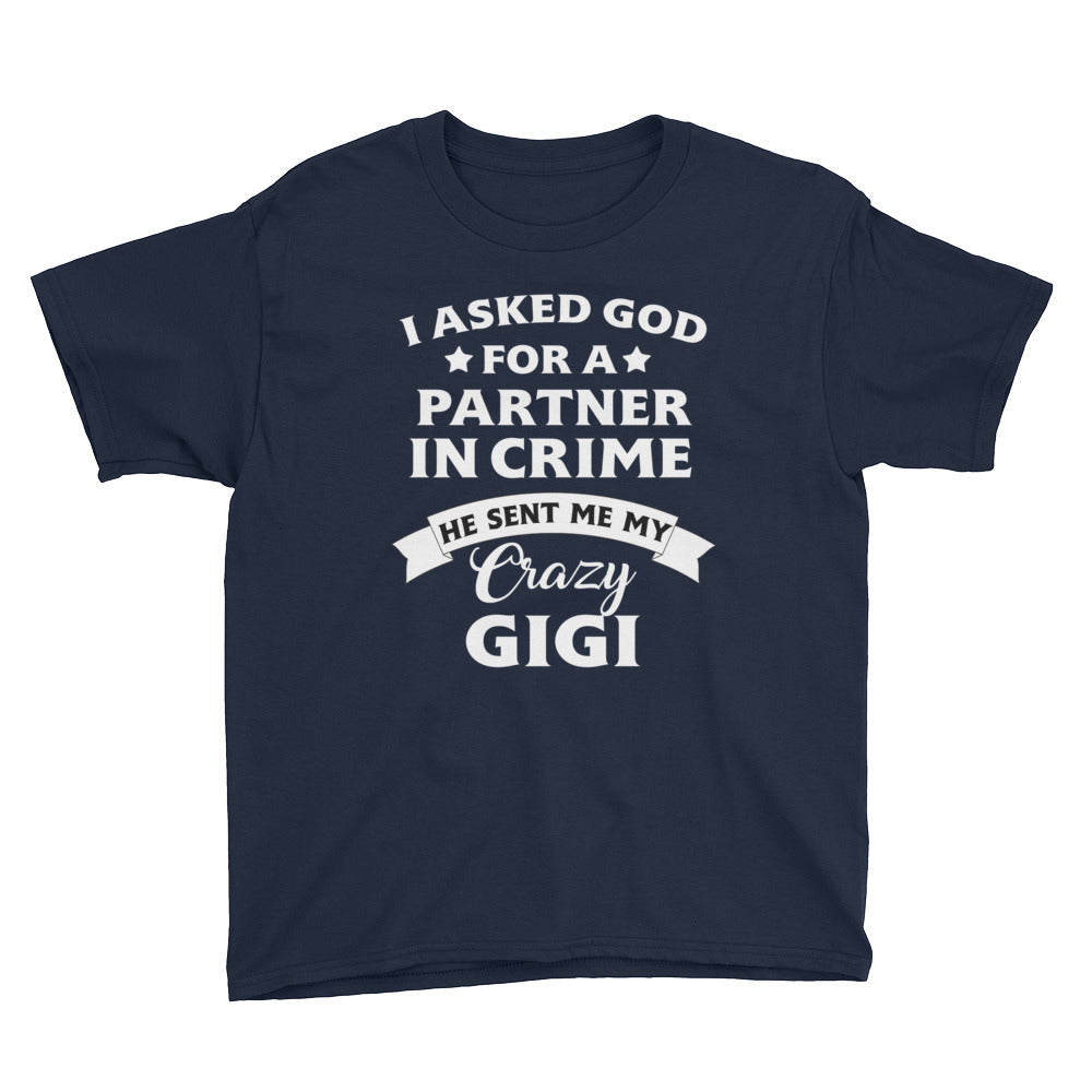 Personalized I Asked God For A Partner In Crime He Sent Me My Crazy GiGi Youth Short Sleeve T-Shirt, Funny Youth T-shirt For Kids